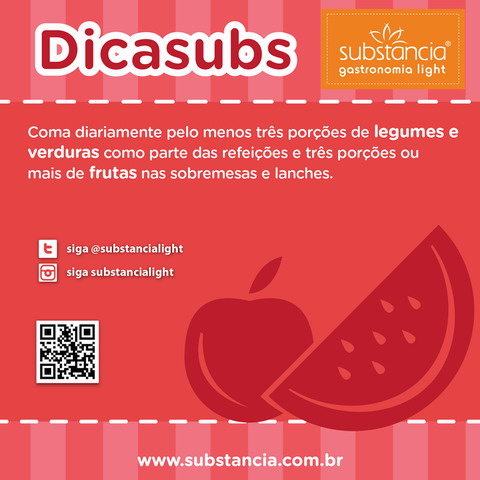 A Substância é uma Grife de Alimentação Saudável, especializada há mais de 20 anos, em produzir o melhor da Gastronomia em sua versão light, além de proporcionar toda a praticidade que nossa atualidade pede!! São pratos deliciosos, caldos, sucos, salgados, sobremesas, programas semanais completos de reeducação alimentar e muito mais!! Nossos produtos passam por uma técnica de ultracongelamento, que além de manter as propriedades e o frescor dos alimentos, torna desnecessária a utilização de aditivos químicos, conservantes ou mega doses de sódio, permitindo que você leve muito mais sabor e saúde para sua casa!!
